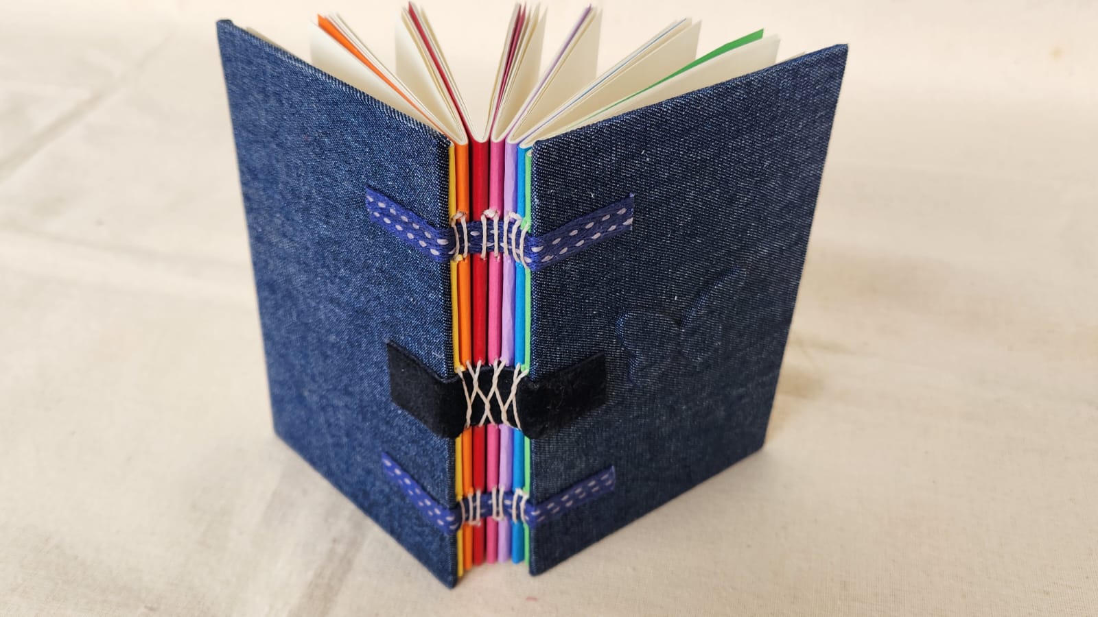 Caderno com encadernação de costura exposta sobre faixas e relevo na capa.